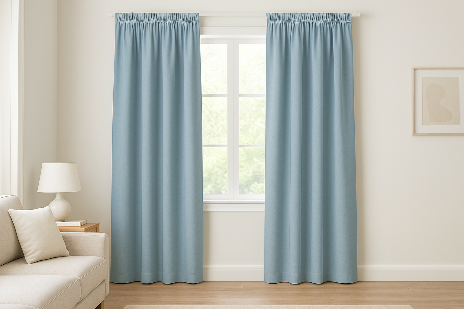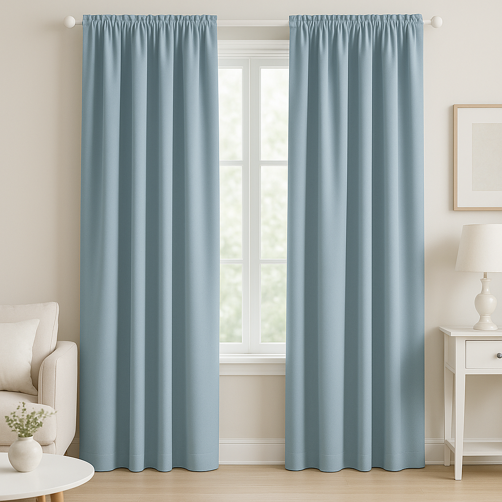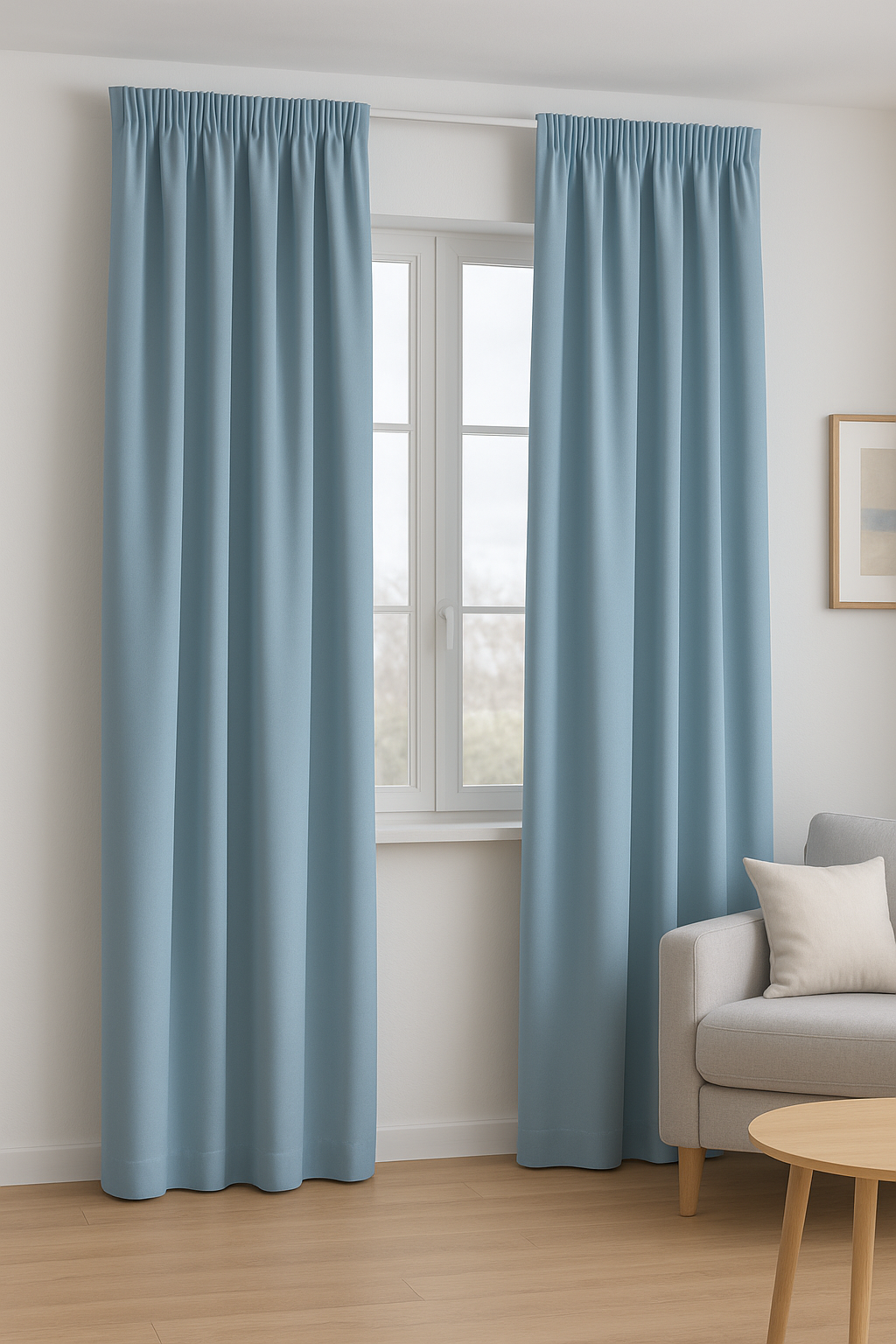 Dodaj swojemu wnętrzu stylu i lekkości dzięki naszym gładkim, błękitnym zasłonom na taśmie marszczącej. To idealny wybór, jeśli cenisz prostotę, elegancję i praktyczne rozwiązania w aranżacji wnętrz.