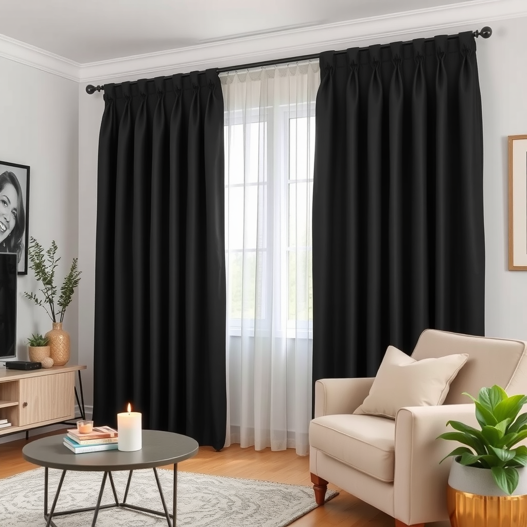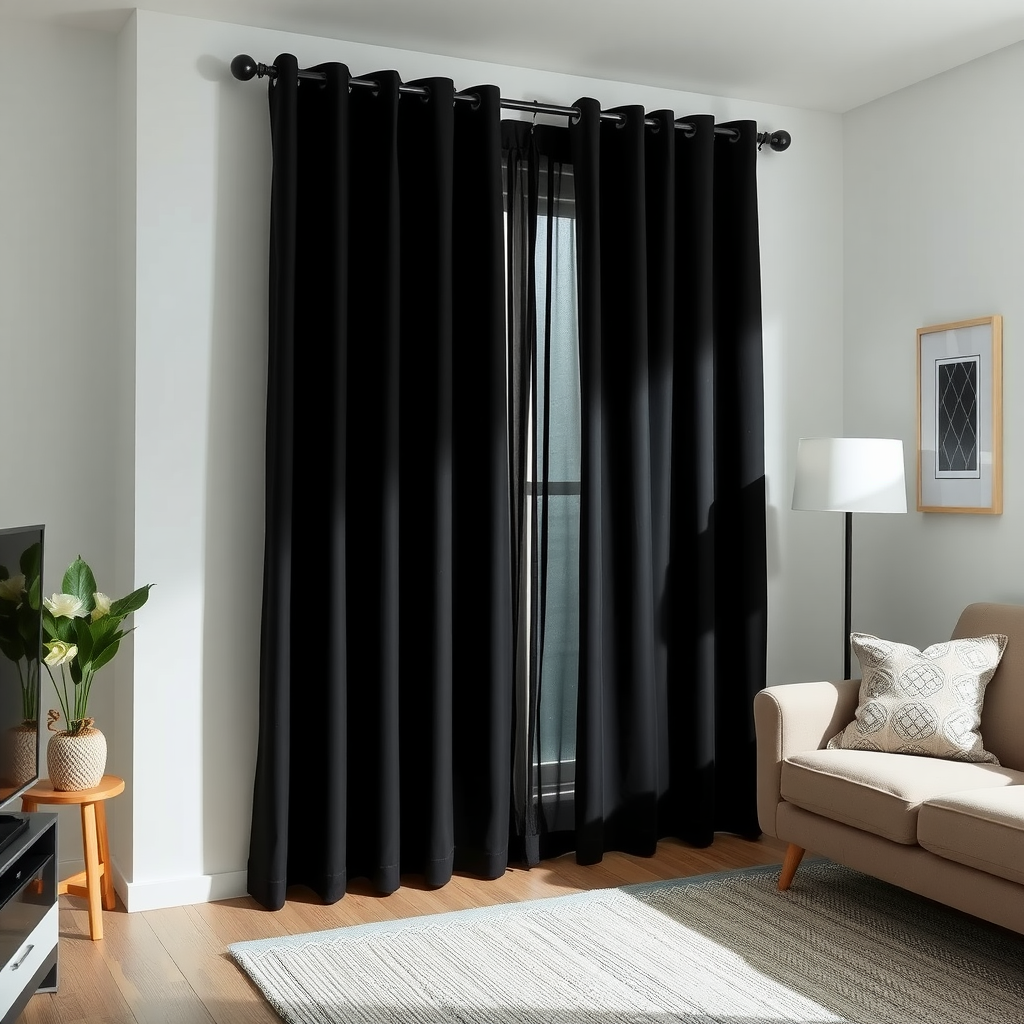 Czarne gładkie zasłony do powieszenia na chromowych przelotkach lub na żabkach.