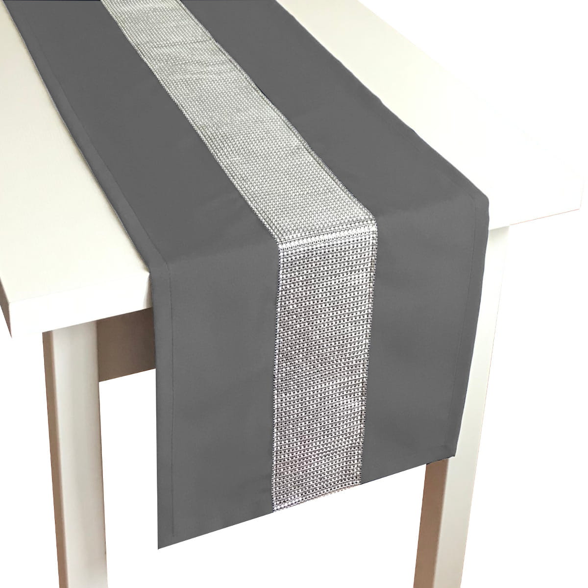 Elegancki bieżnik w głębokim szarym kolorze z połyskującym pasem cyrkonii. Wykonany z trwałej, łatwej w pielęgnacji tkaniny, idealny na uroczystości, kolacje i święta. Subtelny blask cyrkonii doda luksusowego charakteru każdej aranżacji stołu.