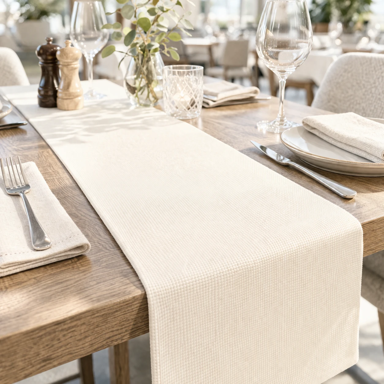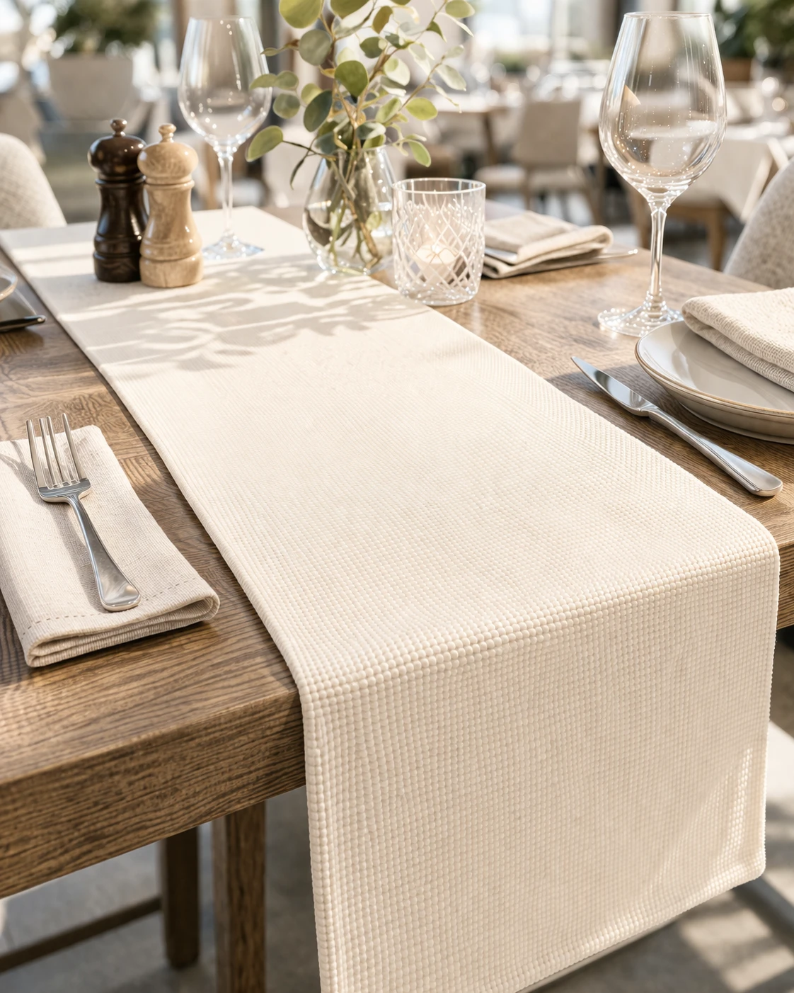 Matowy bieżnik w stylu lnianym w kolorze ecru. Naturalny efekt, cieplejszy odcień niż biel, plamoodporne wykończenie — idealny do restauracji i eleganckich aranżacji stołu.