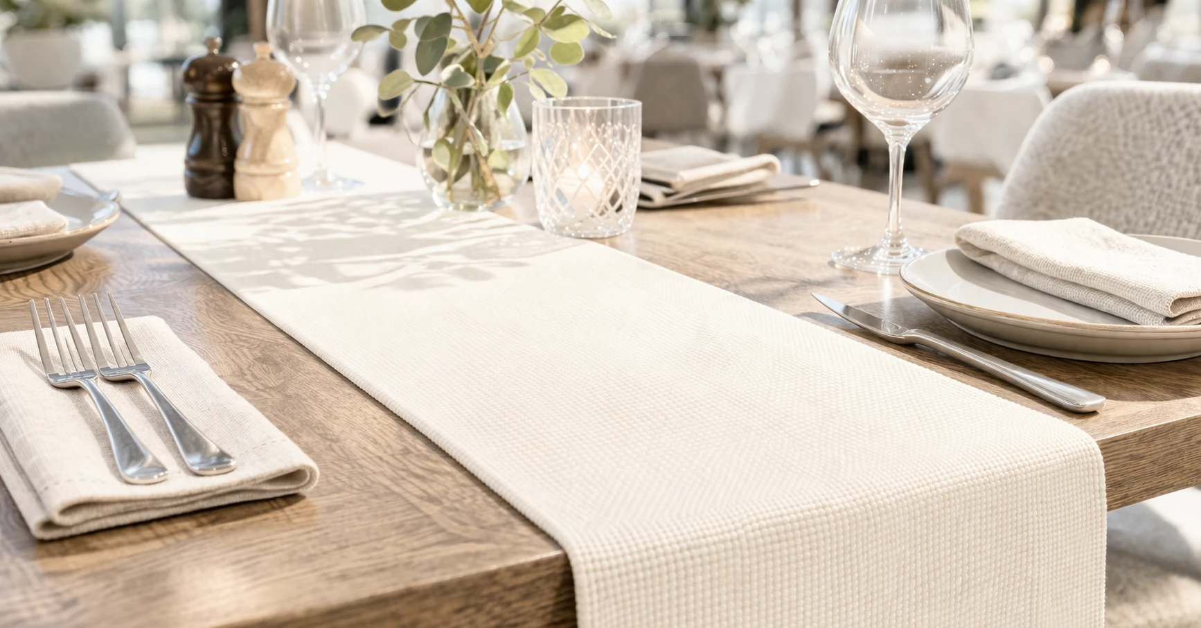 Matowy bieżnik w stylu lnianym w kolorze ecru to propozycja dla lokali i wnętrz, w których liczy się naturalny wygląd stołu i spójna, spokojna aranżacja.