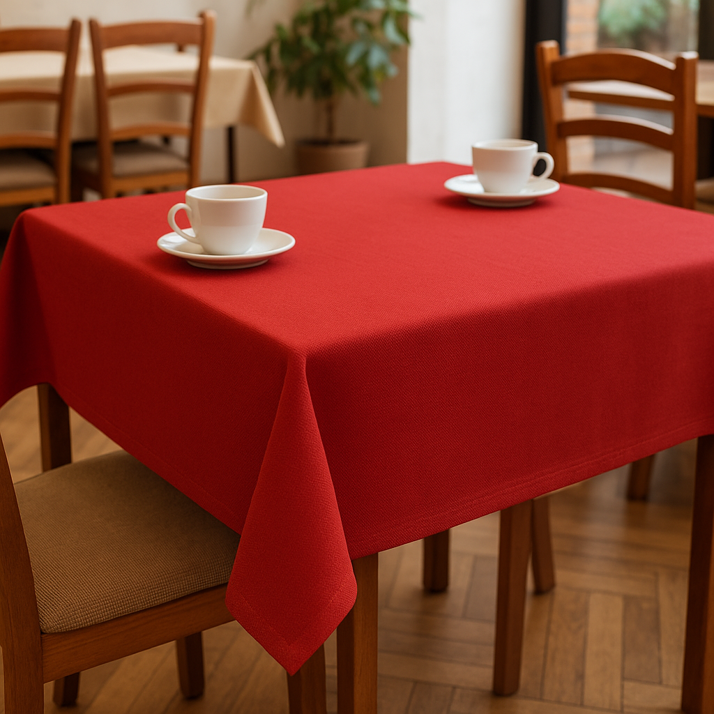 Elegancki obrus w kolorze matowej czerwieni, wykonany z polskiej tkaniny o drobnym, gęstym splocie. Ma całkowicie matowe wykończenie, bez połysku, co podkreśla jego szlachetny charakter. Miękki w dotyku, a jednocześnie stabilny – doskonale się układa i zachowuje idealny kształt na stole.