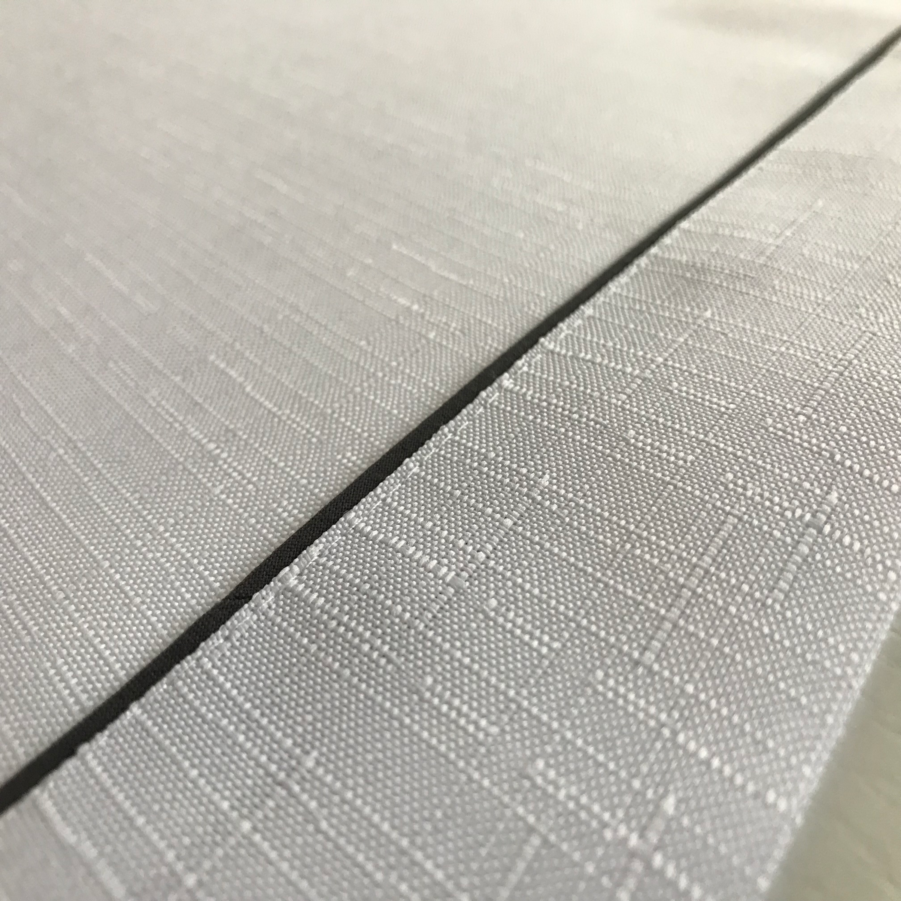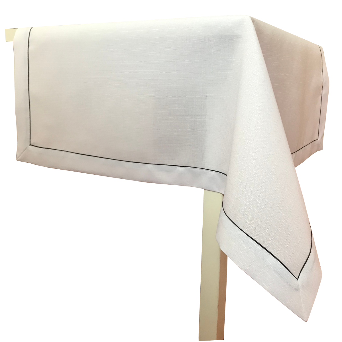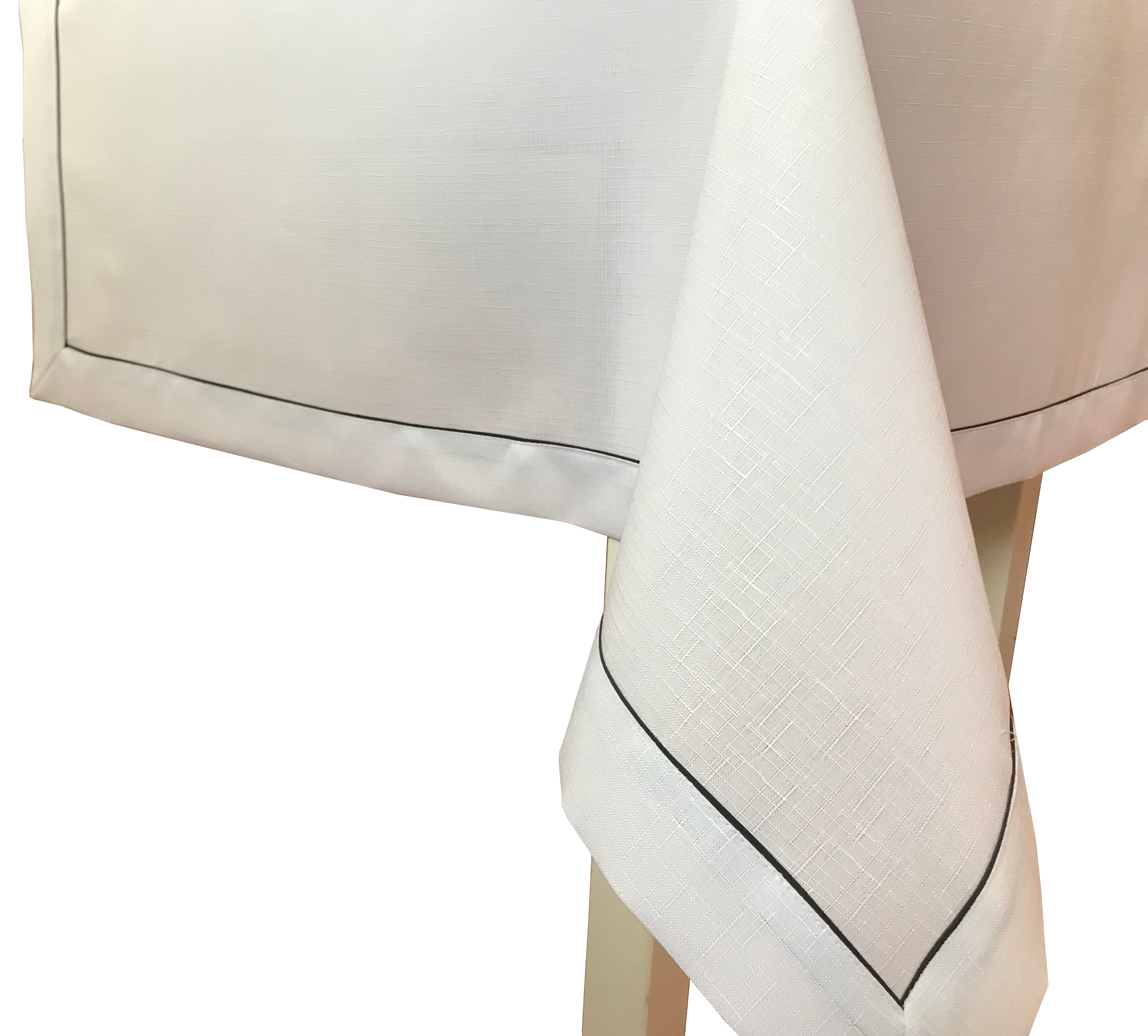 Plamoodporny biały obrus, uszyty z tkaniny o właściwościach, które nie pozwalają na wchłanianie plam w jej strukturę.