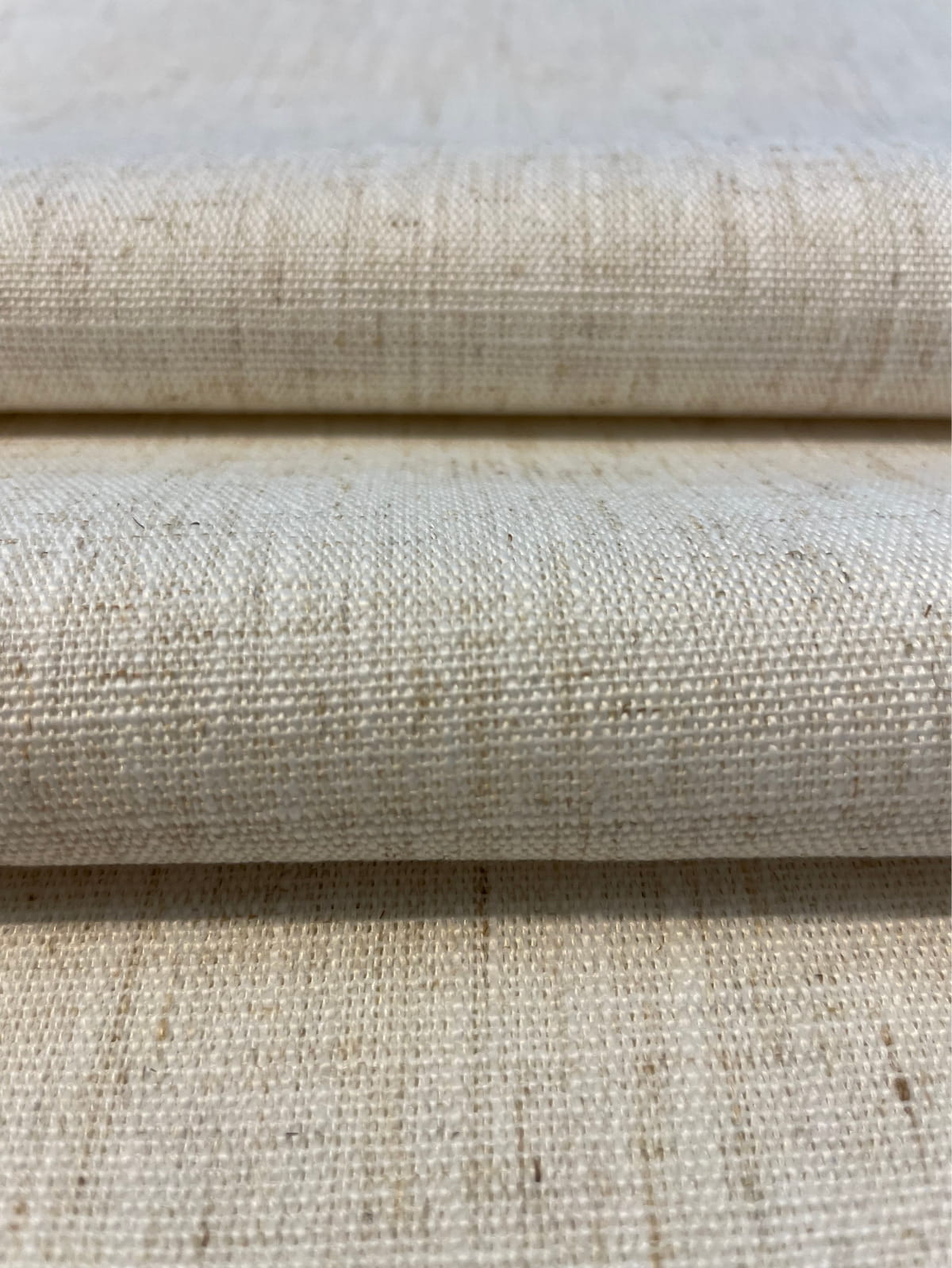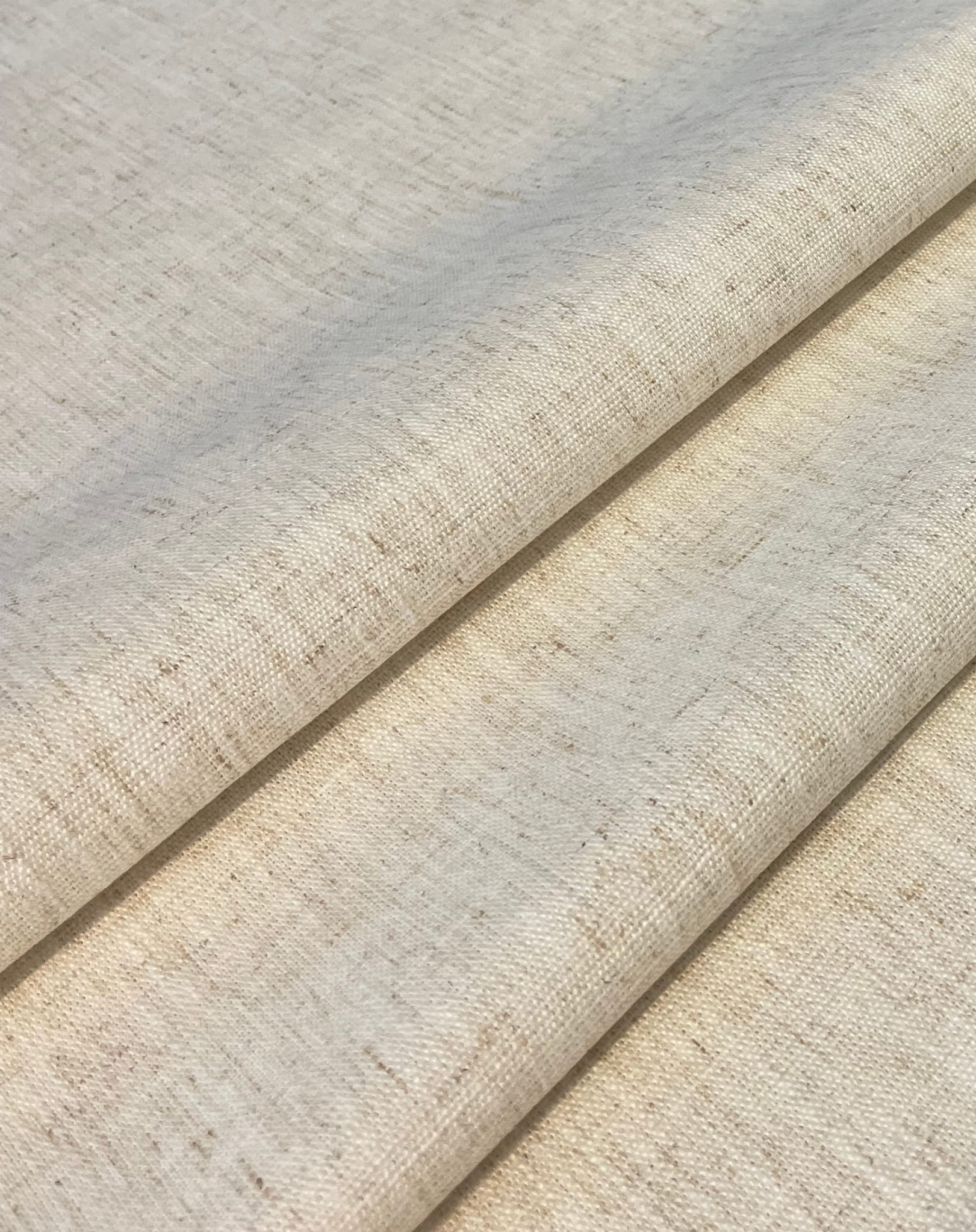 Wygląda jak prawdziwy len – tkanina ma wyraźny, płócienny splot i subtelne nieregularne wtrącenia w odcieniach beżu i brązu, które dodają jej naturalnego uroku.