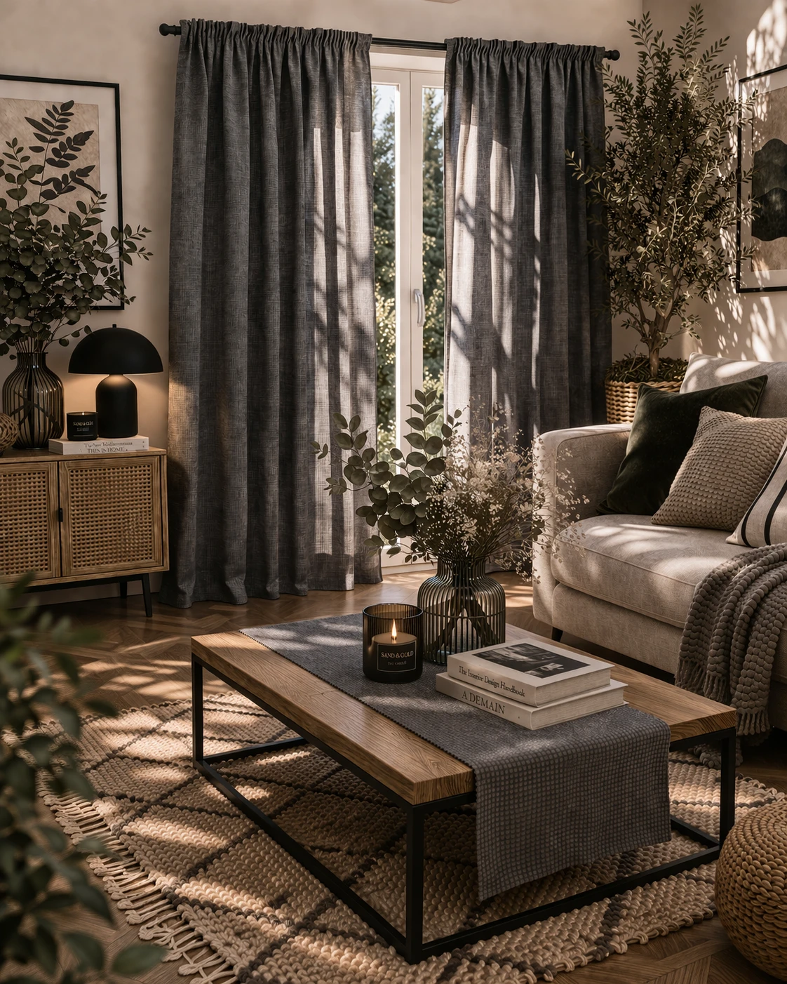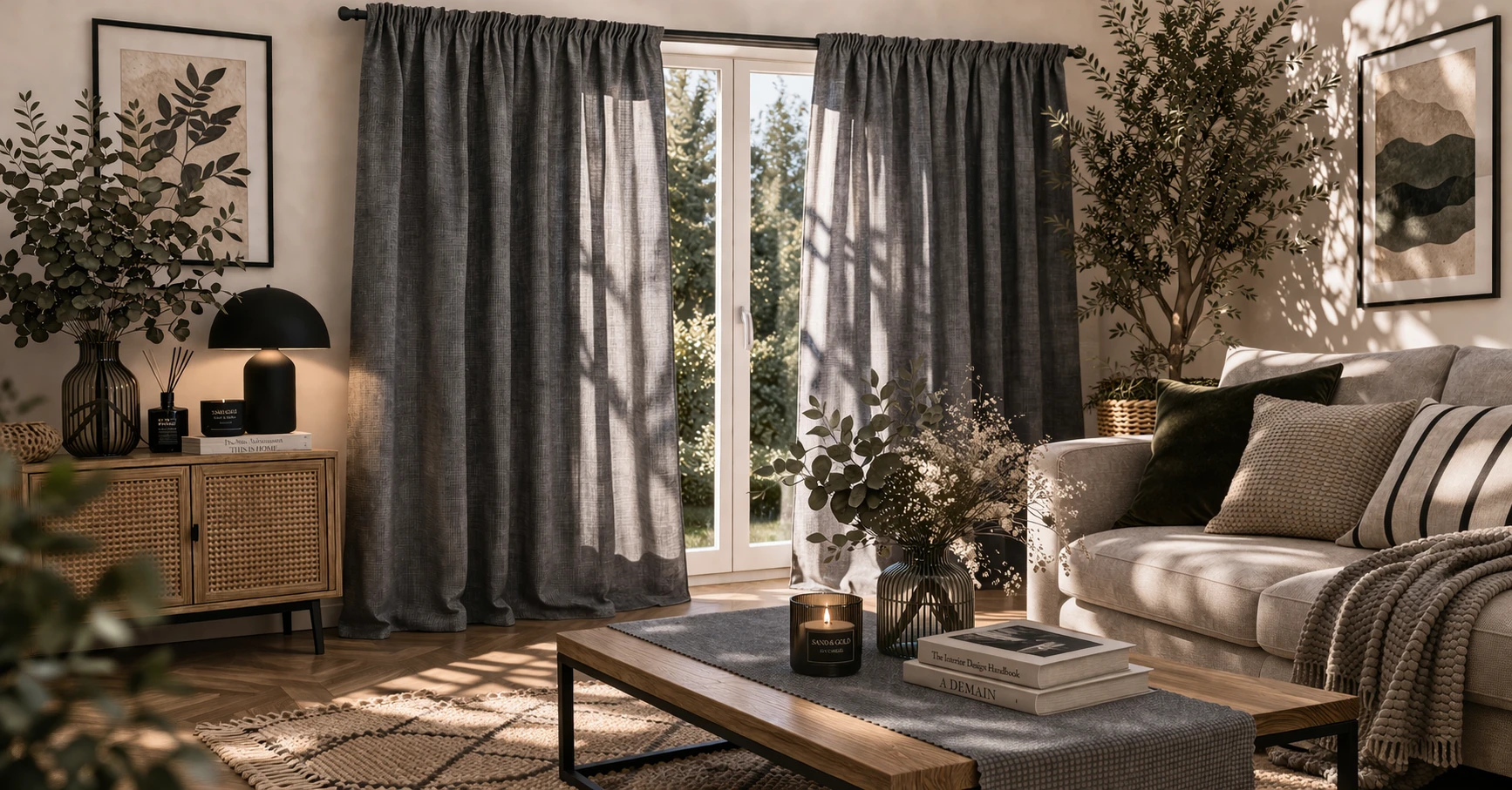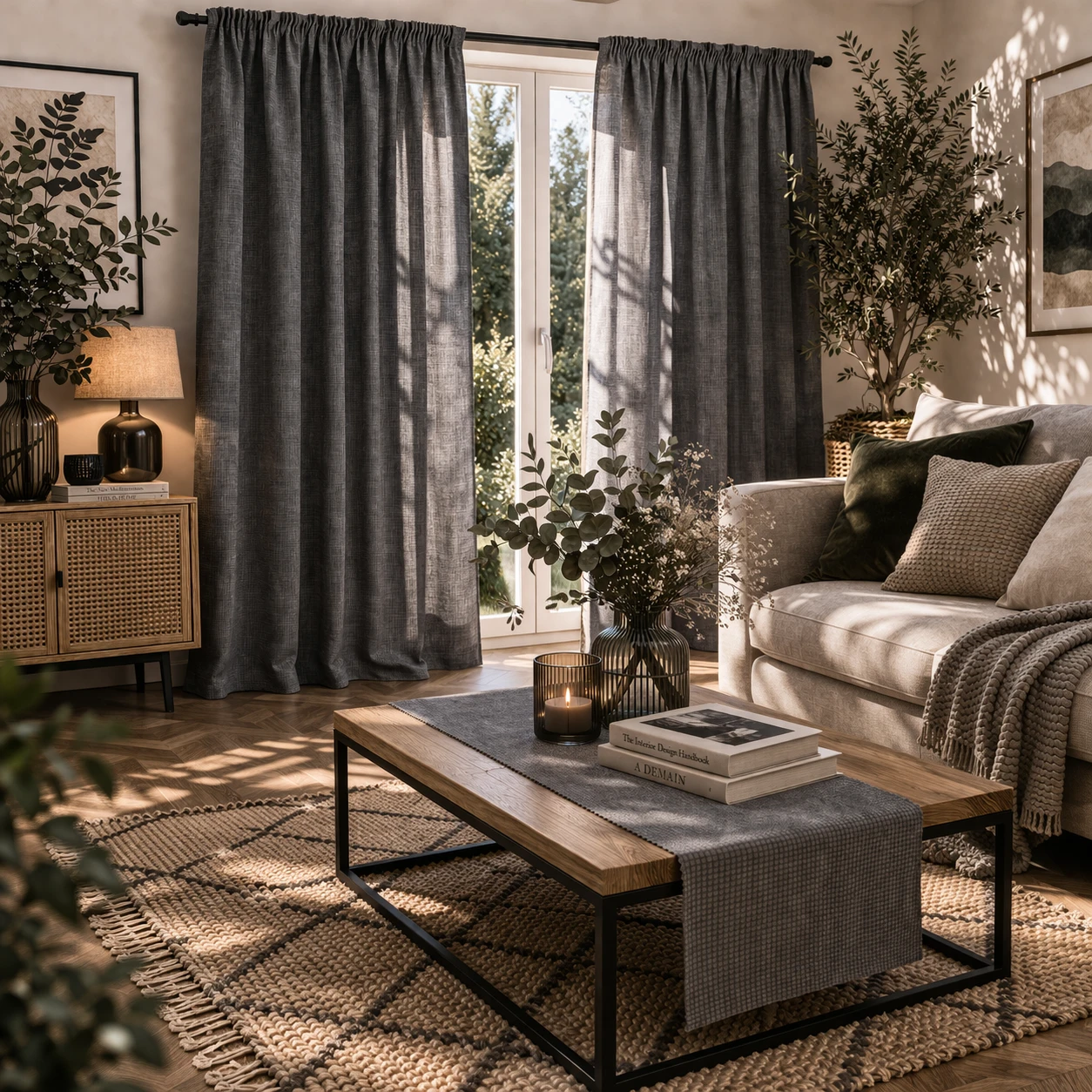 Ciemnoszara zasłona w stylu lnianym sprawdzi się w:
