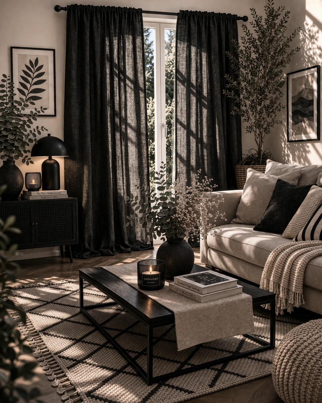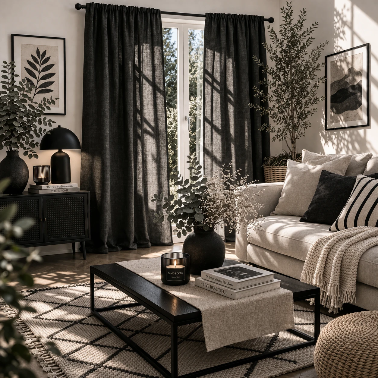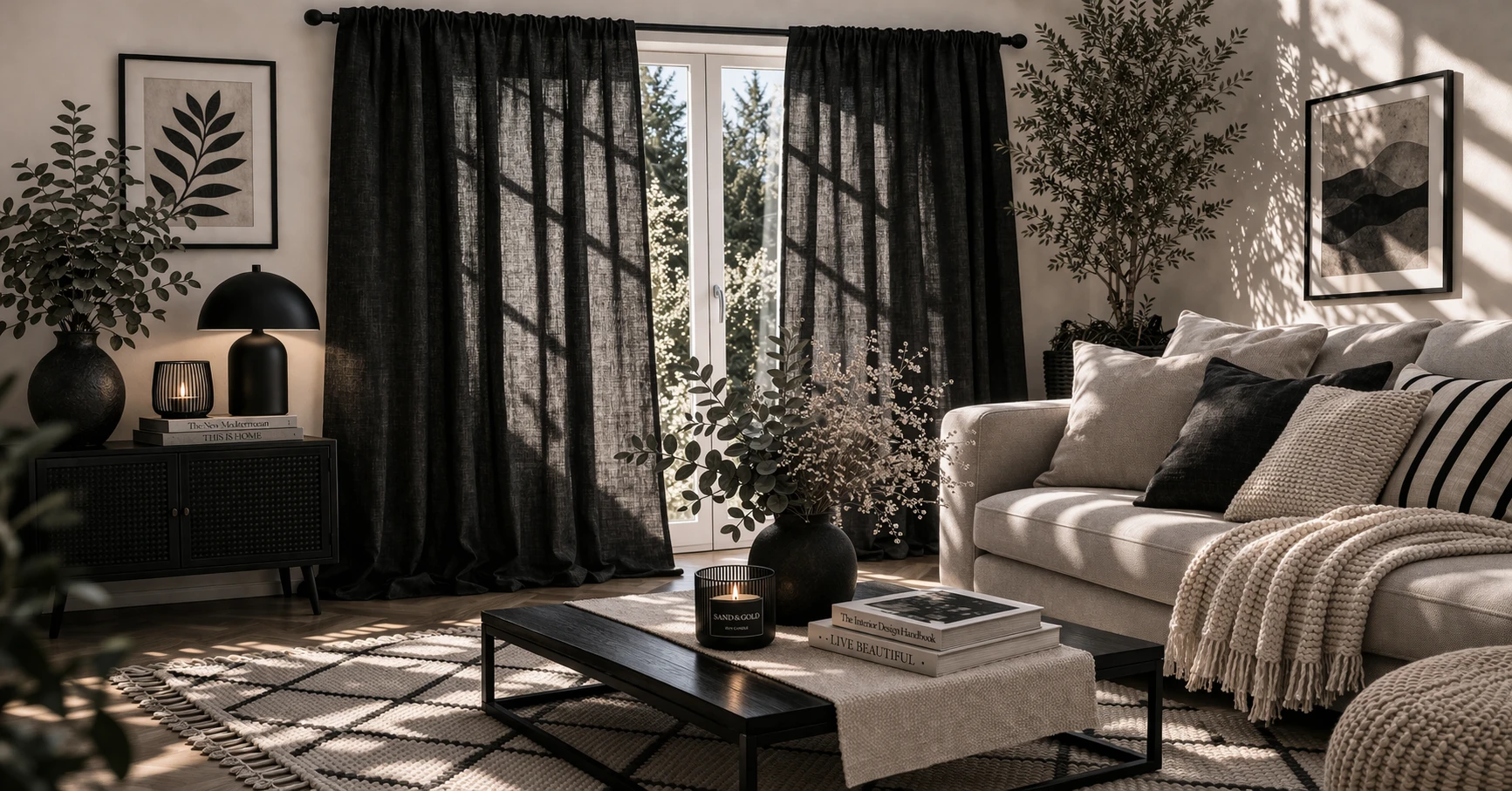 Czarna zasłona dobrze odnajduje się w aranżacjach nowoczesnych, loftowych, minimalistycznych i kontrastowych. Może stanowić mocny element wnętrza albo uzupełniać spokojną bazę kolorystyczną.